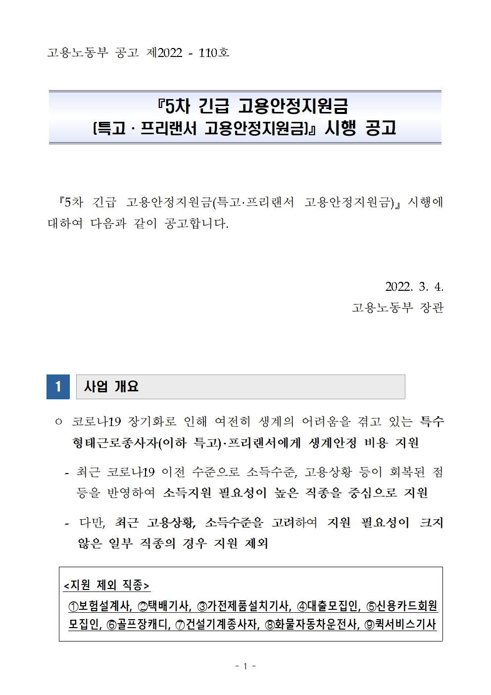 『5차 긴급 고용안정지원금(특고·프리랜서 고용안정지원금)』 시행이 공고되었습니다.장관