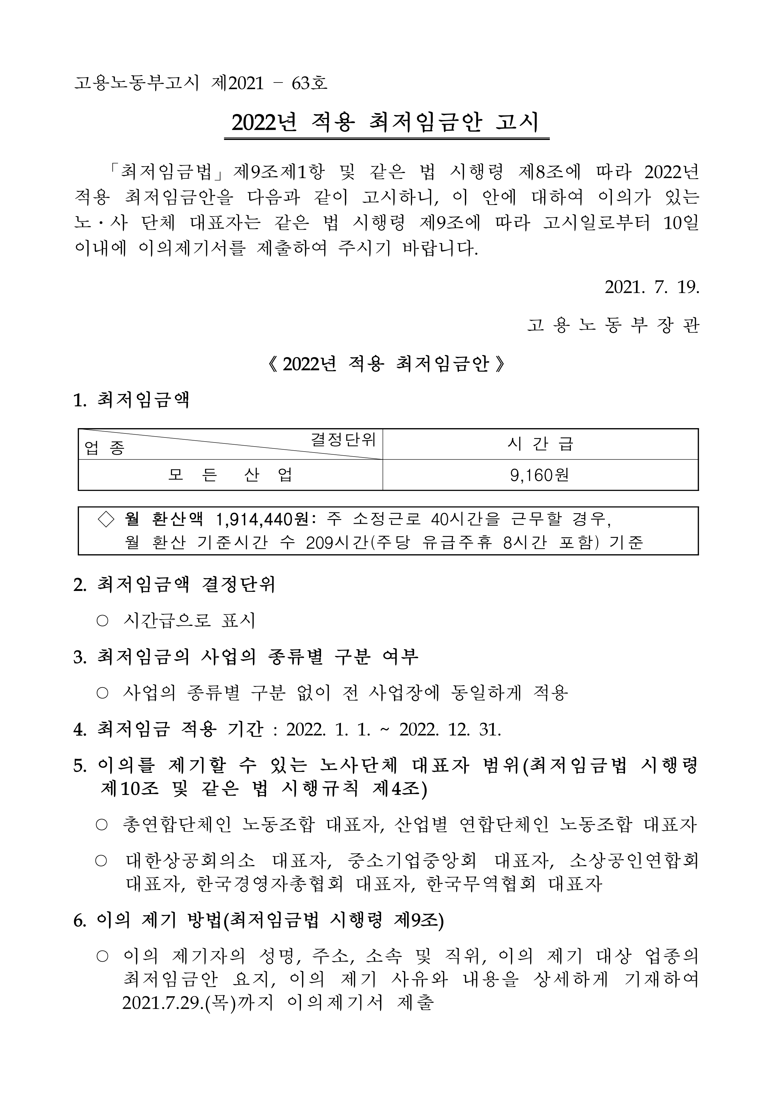 2022년 적용 최저임금안 고시(안)을 안내드립니다.
