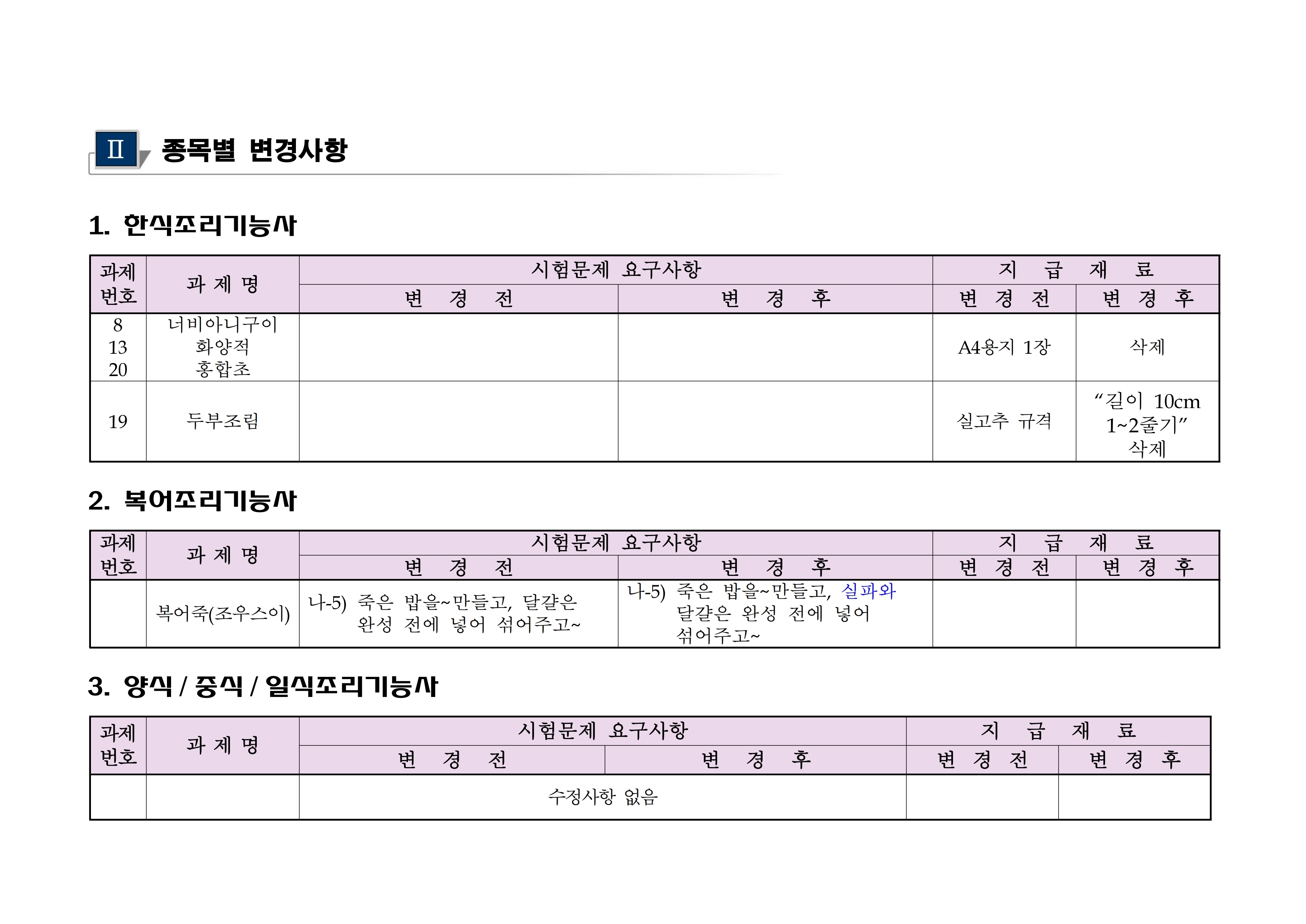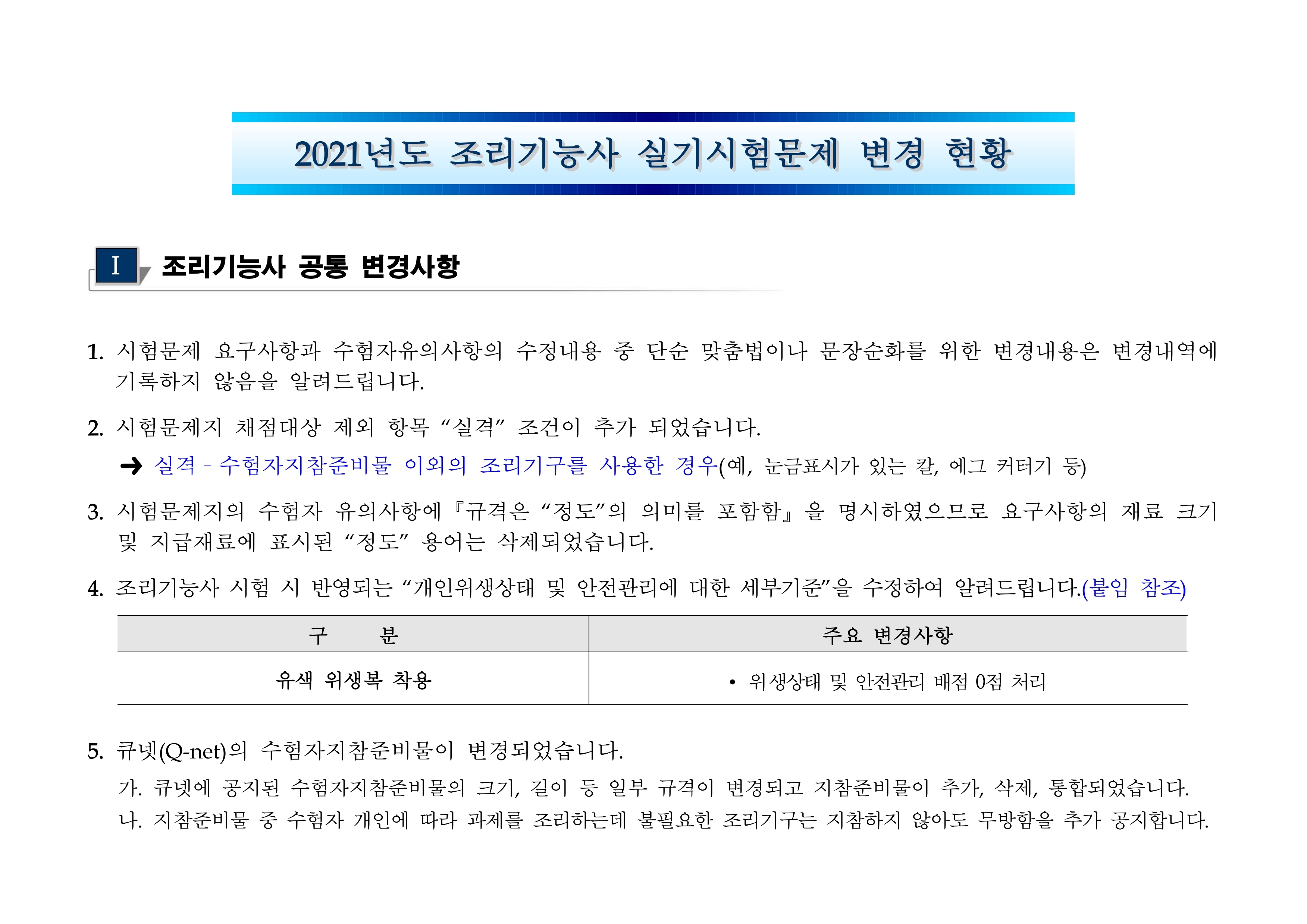 '21년도 조리기능사실기 시험변경 현황, 모두의 합격을 기원합니다.