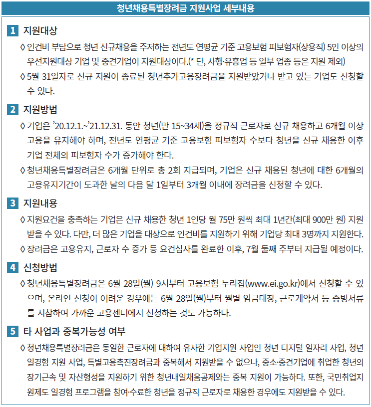 필요하므로 정부 지원을 강화해 나갈 필요가 있다”라고 강조하면서 “이번 청년채용특별장려금이 보다 많
